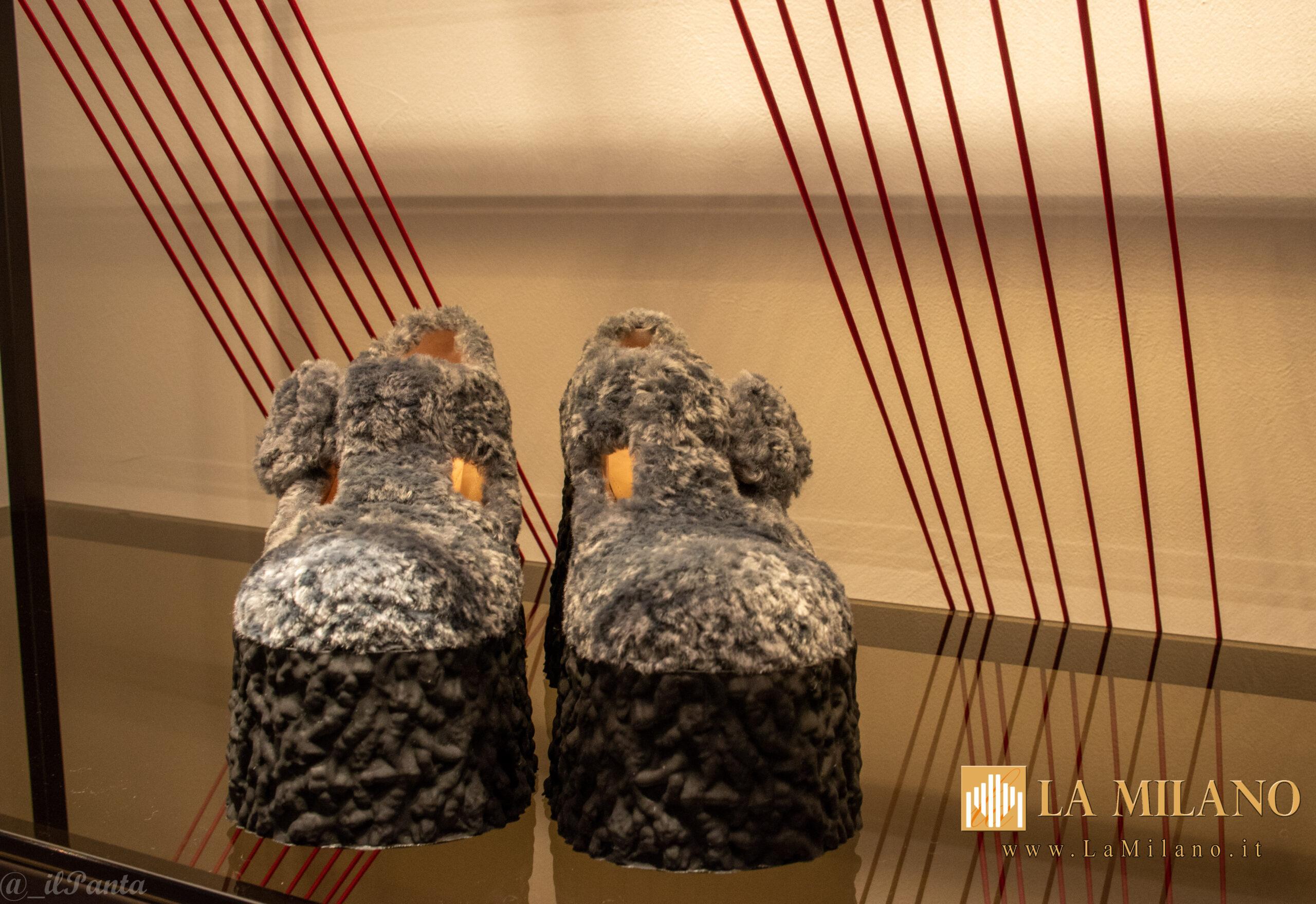L’elemento distintivo della collezione è rappresentato dalle “Geometrie Imperfette”, dove linee imprecise e interrotte si intrecciano su un reticolo di quadretti. Micro borchie metalliche vestono ballerine, mocassini e anfibi, mentre fiocchi ricoperti di cristalli illuminano camoscio maculato e mocassini in pelle rovesciata.